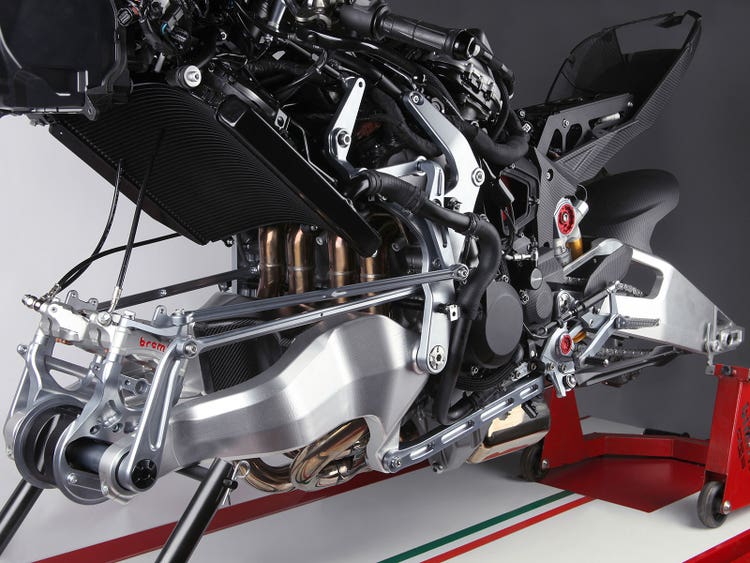 Aluminium alloy billet swingarm, Öhlins TTX36 nitrogen gas charged shock with piggyback reservoir, compression and rebound damping adjustability, hand-adjustable spring preload, top-out spring