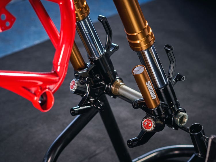 Showa Balance Free 43 mm front fork with external reservoir, compression and rebound damping adjustability, adjustable spring preload, top-out spring