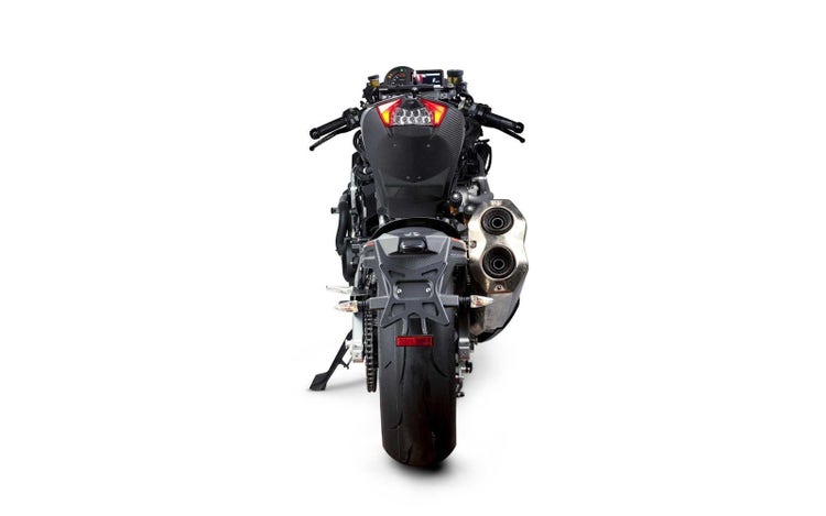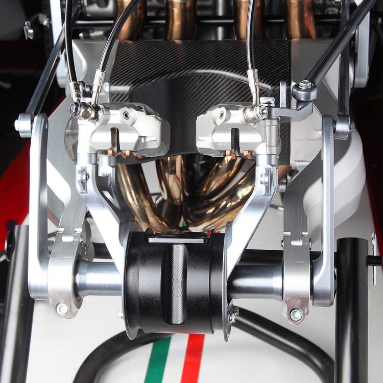 Aluminum alloy billet swingarm, Öhlins TTX36 nitrogen gas charged shock with piggyback reservoir, compression and rebound damping adjustability, hand-adjustable spring preload, top-out spring